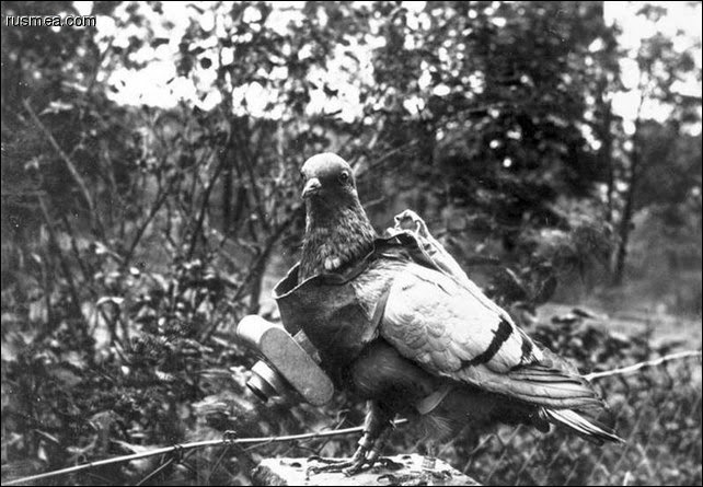 Um pombo com uma pequena câmera acoplada. Pássaros treinados foram usados experimentalmente pelo cidadão alemão Julius Neubronner, antes e durante os anos de guerra, capturando imagens aéreas, através de um mecanismo temporizador que clicava no botão do obturador da câmera.